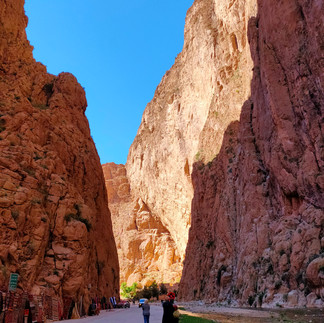 Le mercredi, c'est le grand départ pour le désert ! La route est longue, très longue, mais très belle aussi. On passe par les gorges du Dadès et de Todra, aux roches rouge et à la végétation vert vif, avant d'arriver aux portes du Sahara, où le sable est orange sur un ciel très très bleu. Sortez vos aquarelles !!!